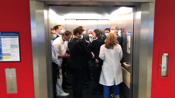 Mit dabei waren bei der Fahrstuhlfahrt unter anderem: Gesundheitsminister Jens Spahn, Hessens Ministerpräsident Volker Bouffier, Kanzleramtschef Helge Braun sowie der hessische Sozialminister Kai Klose und Hessens Leiter der Staatskanzlei Axel Wintermeyer.